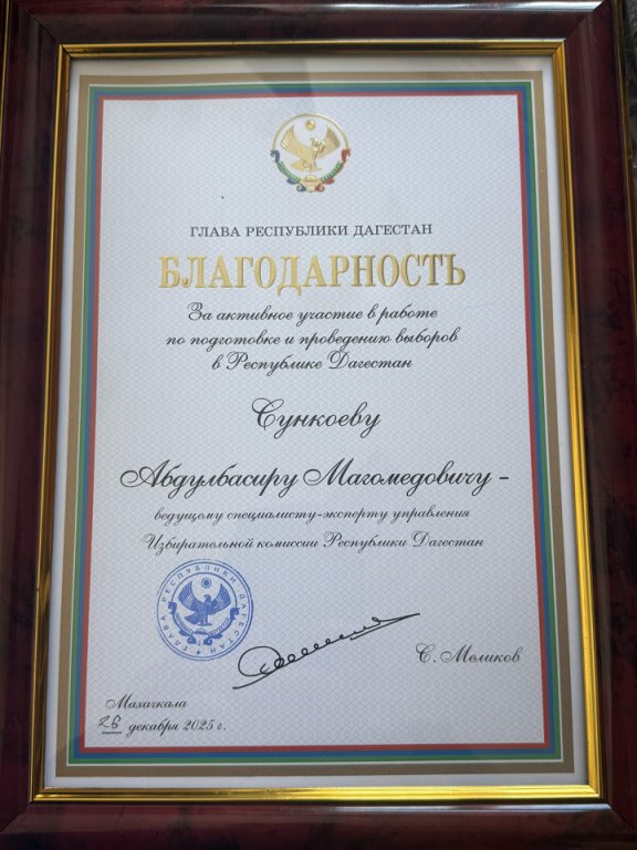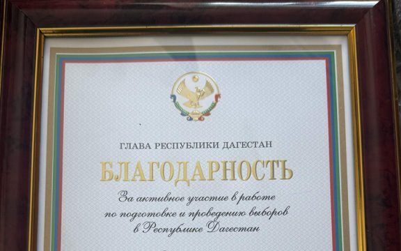 Председатель Избирательной комиссии Республики Дагестан Магомед Дибиров вручил председателю территориальной избирательной комиссии Тляратинского района Абдулбасиру Магомедову благодарственное письмо от имени Главы Республики Дагестан Сергея Меликова 05.02.2026 0 Administrator Награда была вручена за активное участие в подготовке и проведении выборов, а также за вклад в организацию избирательного процесса в регионе. 0